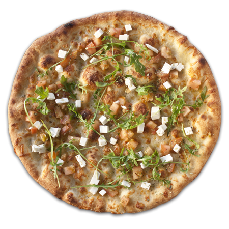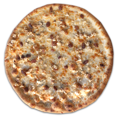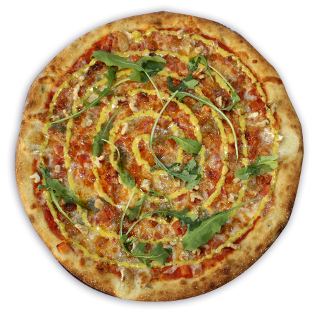 Salsa de tomate, mozzarella, tomate natural, queso de cabra, roquefort, nueces, rúcula y salsa de miel y mostaza.